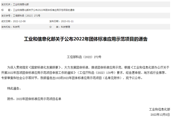 实验室1项团体标准获评工信部2022年百项团体标准应用示范项目